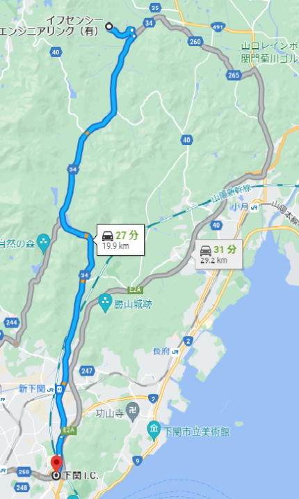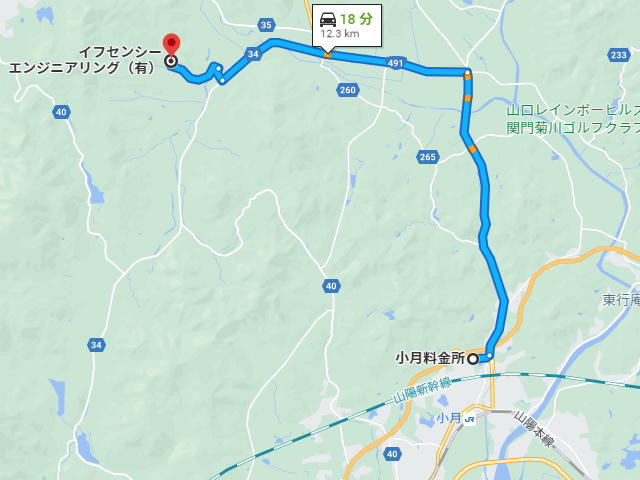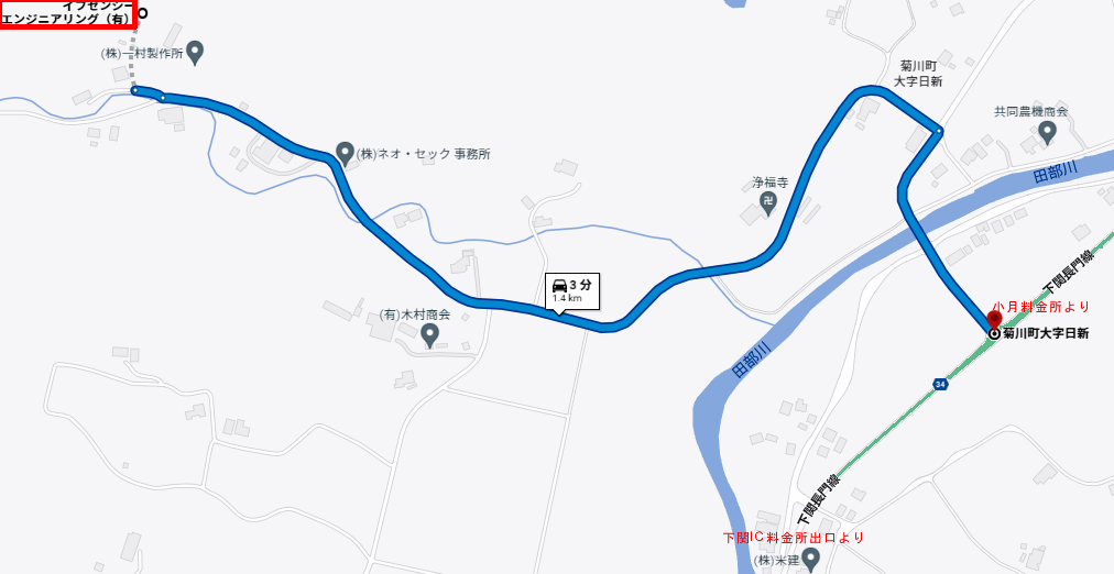 目的地【イフセンシーエンジニアリング有限会社】 ➀下関IC料金所出口より車で27分(➀図参照) ②小月料金所より車で18分 ■ 小月料金所を出て、長門方面(左に分岐)へ進んで下さい。 突き当たりを左へ、さらに、国道【491号線】との交差点を左に、長門・菊川方面へ進んで下さい。道の駅「きくがわ」を左手に見て左折して下さい。国道【491号線】は、2.5㎞程行ったところで、右に反れますが,直進し、県道〔34号線〕に合流して下さい。 ■ 下関IC料金所を出て、広島方面国道【2号線】へ進んで下さい。約5分後、国道【2号線】を分岐し、(左側):豊浦方面県道〔34号線〕へ進んで下さい。 ■ 県道{34号線}からイフセンシーエンジニアリング(有)まで ■県道{34号線}からイフセンシーエンジニアリング(有)まで